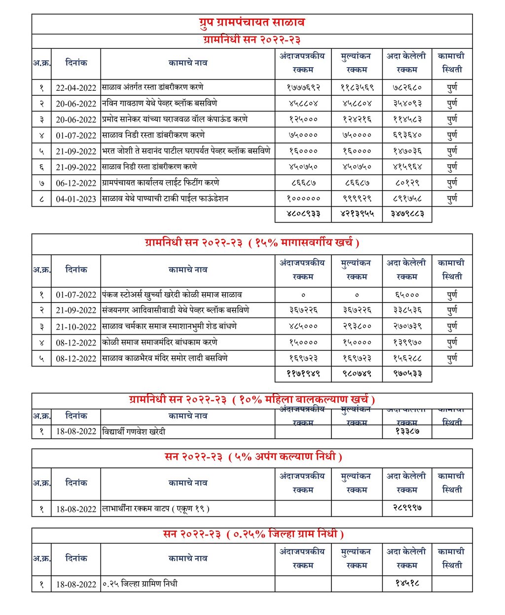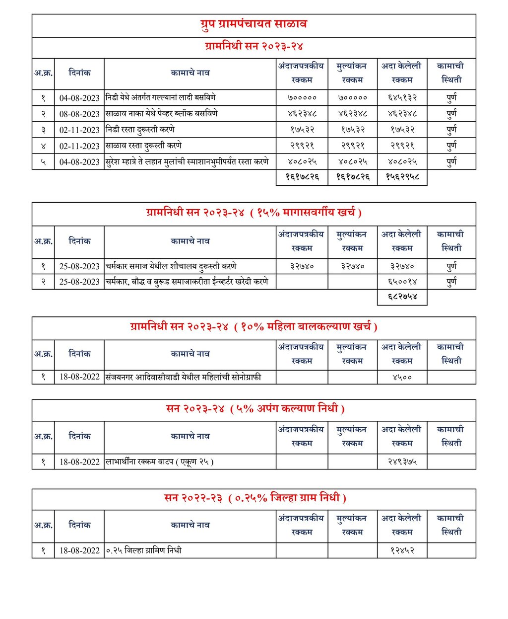 मागील तीन वर्षांत साळाव ग्रामपंचायतीने हाती घेतलेल्या विकास कामांचा सविस्तर लेखाजोखा या अहवालात सादर केला आहे. हा अहवाल साळाव गावातील प्रत्येक नागरिकाप्रती असलेल्या आमच्या पारदर्शकतेच्या आणि जबाबदारीच्या बांधिलकीचा पुरावा आहे. आमच्या सामूहिक प्रयत्नांतून साध्य झालेल्या प्रगतीचा आणि साळावच्या उज्वल भविष्यासाठी आखलेल्या पुढील दिशांचा हा प्रवास पाहण्यासाठी, कृपया खालील अहवाल वाचा.